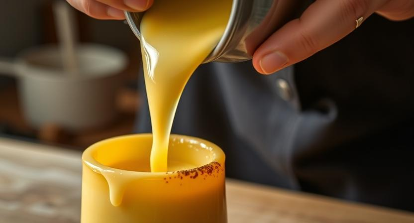 • Slowly pour the melted wax into the candle mold